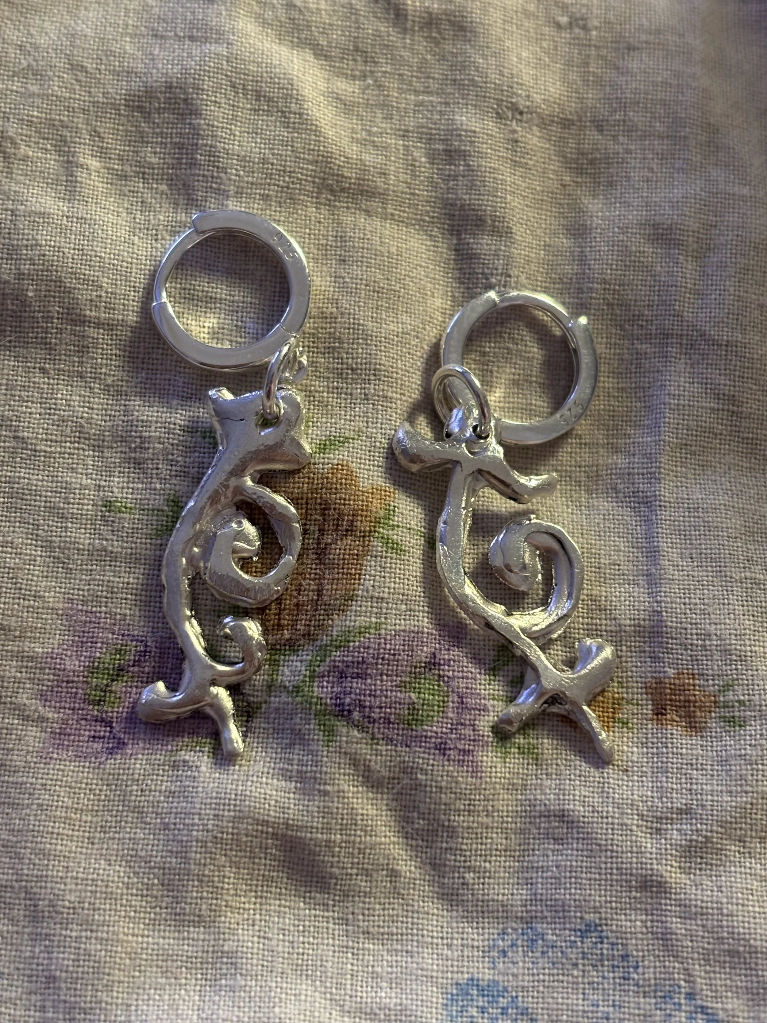 Small sterling silver clasp earrings with unique asymmetrical charms! Handmade using the lost wax casting and carving techniques.